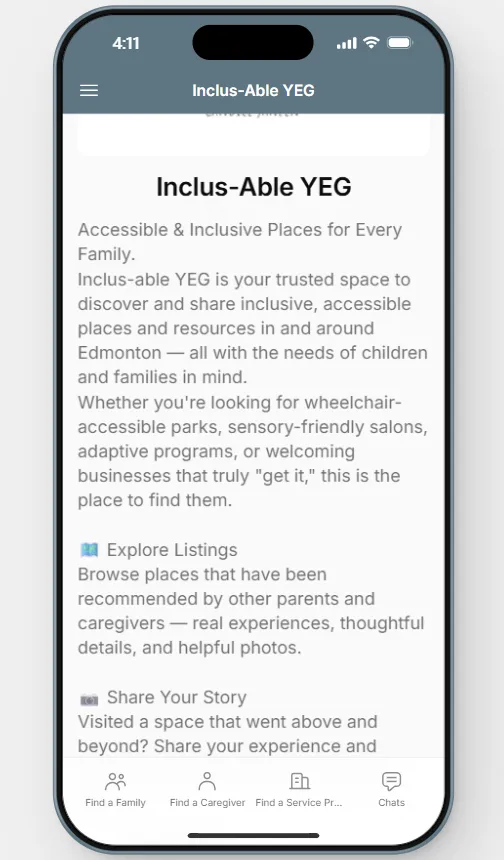 Family Care Connect APP brings families, caregivers, and inclusive community resources together into one easy-to-use platform.